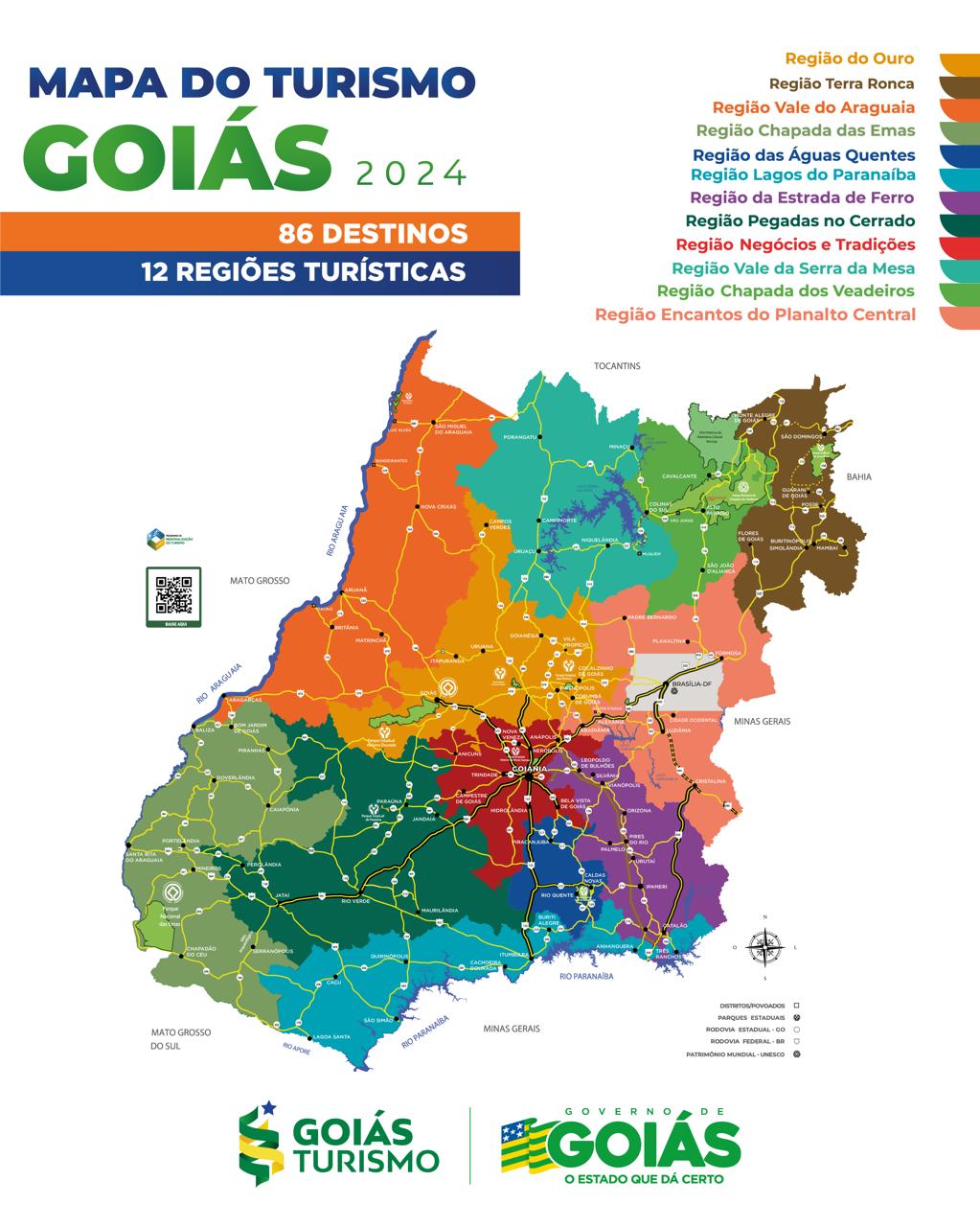 O Governo de Goiás, por meio da Goiás Turismo, divulgou, nesta quarta-feira (19/06), o novo Mapa do Turismo 2024, que passa a contar com 86 municípios, distribuídos em 12 regiões turísticas (Ouro, Chapada dos Veadeiros, Chapada das Emas, Estrada de Ferro, Águas Quentes, Encantos do Planalto Central, Negócios e Tradições, Lagos do Paranaíba, Pegadas no Cerrado, Terra Ronca, Serra da Mesa e Vale do Araguaia).